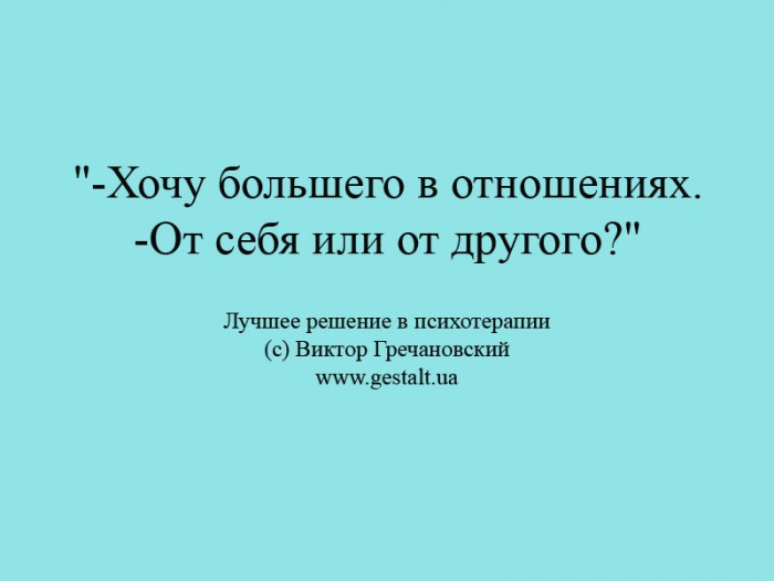 Вопрос далеко не праздный. Всё больше людей понимают важность отношений, но к сожалению, по прежнему, большинство считает, что имеет право на лучшее отношение к себе со стороны другого, при этом не желая меняться самому. Давно известно, что проще, безопаснее и эффективнее начать изменения в отношениях с себя, а не с другого. Тогда в чём причина, что человек ждёт, упорствует, настаивает на собственной правоте, вместо того, чтобы задуматься над собственными изменениями? Большое значение имеет механизм психологической защиты, под названием "проекция", это когда не видя, что-то негативное в себе, я проецирую "это негативное" на другого человека, не будучи в состоянии вернуть себе "своё". Но всё ли так просто? Нет, нет и ещё раз нет. В психотерапии Лучшего решения возможен поиск причин и следствий в отношениях, которые выходят далеко за рамки "проекции" и других защитных механизмов психики.