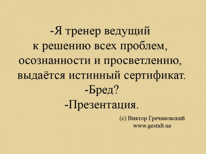 -Я тренер ведущий к решению всех проблем, осознанности и просветлению, выдаётся истинный сертификат. -Бред? -Презентация.