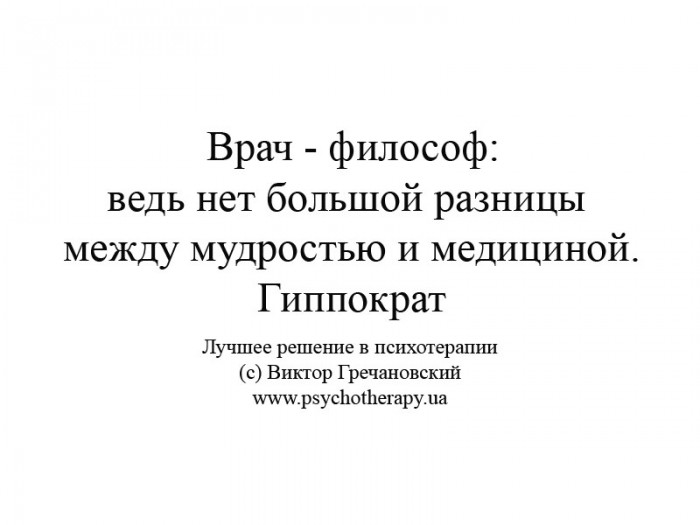 Врач-философ, призван всей своей учёбой, всем своим опытом, всей своей жизнью искать и находить Лучшее решение в психотерапии.